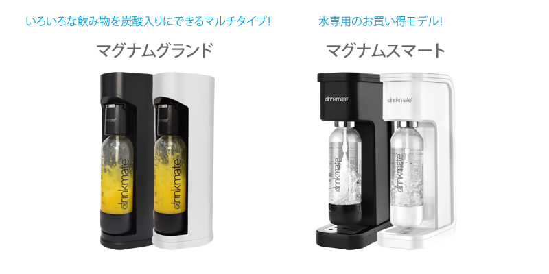 新しく登場したマグナムシリーズは2ラインで、マグナムグランドは従来のドリンクメイトと同様に紅茶や、お酒、スポーツドリンクなど様々な飲料をスパークリング飲料にできます。マグナムスマートは、水専用で炭酸水を愛飲するヘビーユーザーの方にオススメです。